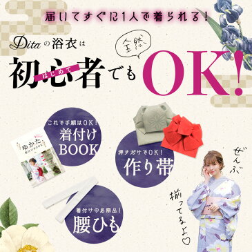 浴衣×1、作り帯×1、下駄×1、着付け本×1、腰紐×1合計5点セット 対応サイズ 浴衣対応身長:152〜167cm 身丈162、袖丈49、ゆき丈67cm 下駄対応サイズ:約24cm (鼻緒は使用日より前に、一日数時間履きならしておくとフィットします♪